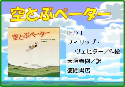 ある日ペーターの一家は、南の島まで旅行することになりました。空が飛べるペーターは、飛行機に乗らずに南の島まで飛んでいくことにします。飛行機に乗ったお父さんとお母さんを見送り、ペーターの空飛ぶぼうけんの旅が始まりました。(K)
