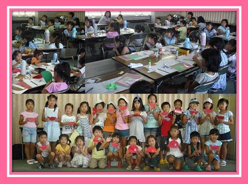みんなでスイカのカードやコースターをつくって、動物や虫などの切り紙を貼って作品にしました。
