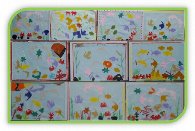 カニやさかなやイルカなどをきり紙でつくって、「海の世界」をつくりました。
