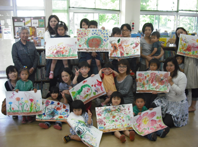 2~4歳の親子11組で、絵の具とパステルで、お花畑を描きました。