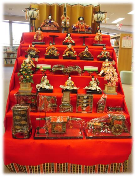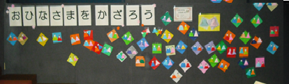 大和田図書館で、子どもたちが作った折り紙のおひなさまをかざりました。
