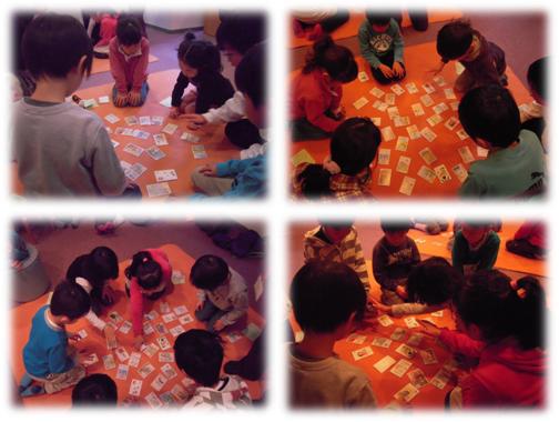 みんなで、かるたとりをしたり、おてだまをしたりして楽しく遊びました。かるたとりでは、読み手がふだをよむのをきちんと聞いて、絵ふだをとっていました。
