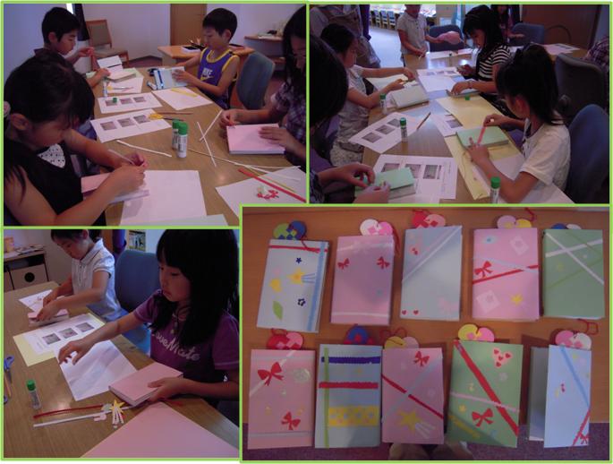 みんなで作った「なつのおもいで」は2階児童室にかざってあるので、ぜひ見に来てください。