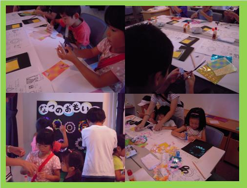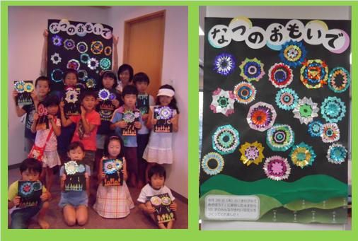 最後にはすてきな花火のカードと、大きな展示「なつのおもいで」を作りました。