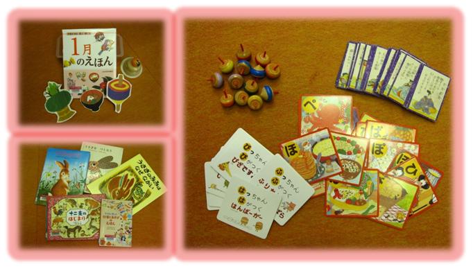 お正月のおはなしをした後には、かるたとりをしたり、こまをまわしたりして遊びました。