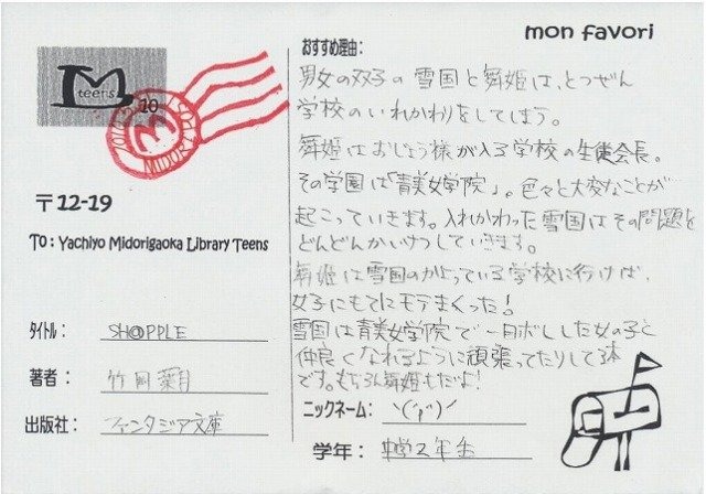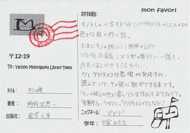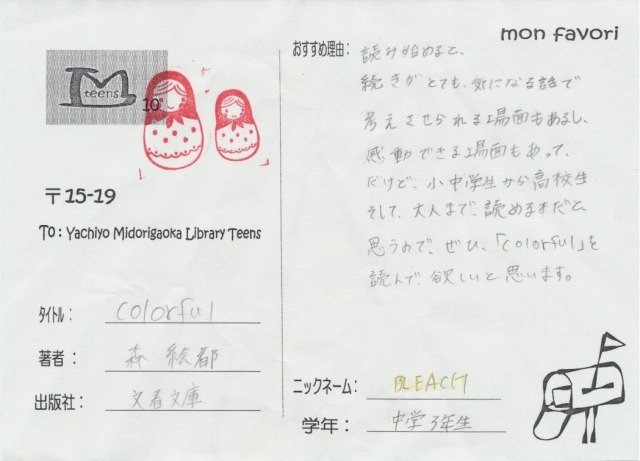 読み始めると、続きがとても気になる話で考えさせられる場面もあるし、感動できる場面もあって。だけど、小中学生から高校生そして、大人まで読める本だと思うので、ぜひ、「colorful」を読んで、欲しいと思います。