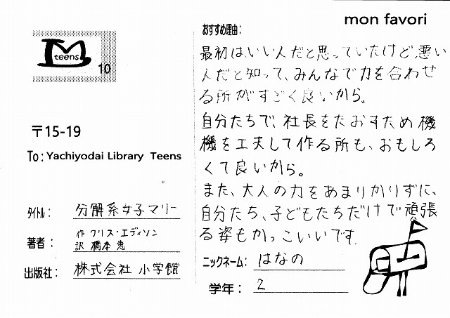 最初はいい人だと思っていたけど、悪い人だと知って、みんなで力を合わせる所がすごく良いから。自分たちで、社長をたおすため機械を工夫して作る所も、おもしろくて良いから。また、大人の力をあまりかりずに、自分たち、子どもたちだけで頑張る姿もかっこいいです。