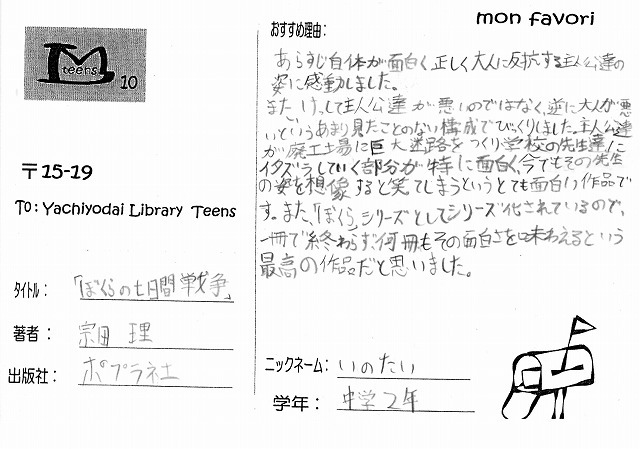 あらすじ自体が面白く正しく大人に反抗する主人公達の姿に感動しました。また、けっして主人公達が悪いのではなく、逆に大人が悪いというあまり見たことのない構成でびっくりしました。主人公達が廃工場に巨大迷路をつくり学校の先生達にイタズラしていく部分が特に面白く、今でもその先生の姿を想像すると笑ってしまうというとても面白い作品です。また、「ぼくら」シリーズとしてシリーズ化されているので、一冊で終わらず、何冊もその面白さを味わえるという最高の作品だと思いました。