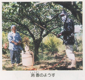 このころの梨作りは、今の方法とはちがい、ひとつひとつの仕事が手間のいる、時間のかかる仕事でした。肥料は「人糞(じんぷん)」を使いました。おけに人糞を入れて、てんびんぼうでかたにかつぎ運びました。消毒は、薬のはいっているおけに手こぎのポンプを入れて、一人がポンプをこぎ、もう一人が薬を梨にかけるものでした。