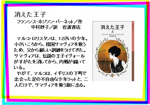 『消えた王子 上・下』 フランシス・ホジソン・バーネット/作,中村妙子/訳,岩波書店,933/バ