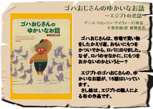 エジプトのゴハおじさんのゆかいなお話が、15話はいっています。さし絵は、エジプトの職人による布の作品です。