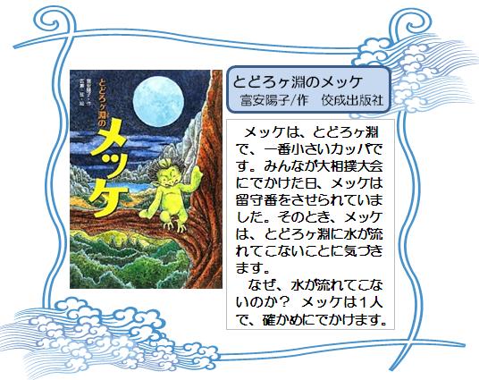 メッケは、とどろヶ淵で、一番小さいカッパです。みんなが大相撲大会にでかけた日、メッケは留守番をさせられていました。そのとき、メッケは、とどろヶ淵に水が流れてこないことに気づきます。なぜ、水が流れてこないのか?メッケは1人で、確かめにでかけます。