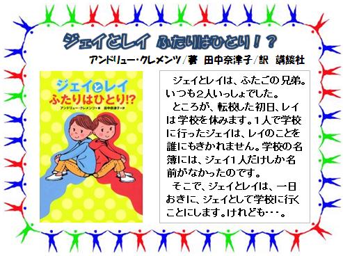 『ジェイとレイふたりはひとり!?』 アンドリュー・クレメンツ/著,田中奈津子/訳,講談社,933/ク