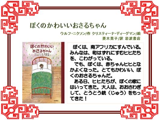 『ぼくのかわいいおさるちゃん』 ウルフ・ニルソン/作,菱木晃子/訳,クリスティーナ・ディーグマン/絵,岩波書店,949/ニ