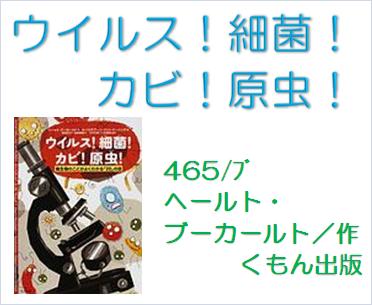 『ウイルス!細菌!カビ!原虫!』 ヘールト・ブーカールト/作,セバスチアーン・ファン・ドーニンク/絵,野坂悦子/訳,塩崎香織/訳,出井正道/監修 ,小林直樹/監修,くもん出版,465/ブ