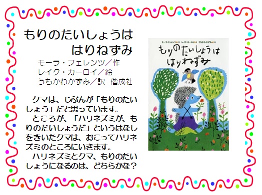 クマは、じぶんが「もりのたいしょう」だと思っています。ところが、「ハリネズミが、もりのたいしょうだ」というはなしをきいたクマは、おこってハリネズミのところにいきます。ハリネズミとクマ、もりのたいしょうになるのは、どちらかな?