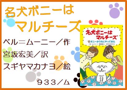 『名犬ボニーはマルチーズ』 ベル・ムーニー/作,宮坂宏美/訳,スギヤマカナヨ/絵,徳間書店,933/ム