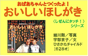 秋になると実ができる“かき”。かきには、そのまま食べてもあまくておいしい“あまがき”と、“ほしがき”にしないとしぶくて食べられない“しぶがき”があるのを知っていますか?この本は、しぶくておいしくない“しぶがき”をあまくておいしい“ほしがき”にするまでのやり方を教えてくれます。本のさいごにほしがきの作り方がかいてあるので、ほしがきづくりにちょうせんしてみるのもおもしろいと思います。(I)