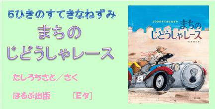 ちゃたろう、くろ、ちびすけ、ぐれ、しろこの五匹のねずみは、あるばんのこと、ねずみじどうしゃレースのお知らせを見つけました。なんとゆうしょうすると、みたこともないくらい大きなチーズがもらえるようです!くいしんぼうのぐれは、どんなチーズなのか気になってしかたがありません。そこで五匹は、あちこちからざいりょうをあつめ、さいこうのじどうしゃを作ってレースに出ることにしました。ところが、おもちゃやのねずみたちは、とてもはやく走るラジコンカーでレースに出るようです。さあ、五匹のねずみたちはゆうしょうして、みたこともないくらい大きなチーズを手に入れることができるのでしょうか?ハラハラドキドキして、とても楽しいおはなしです。(I)